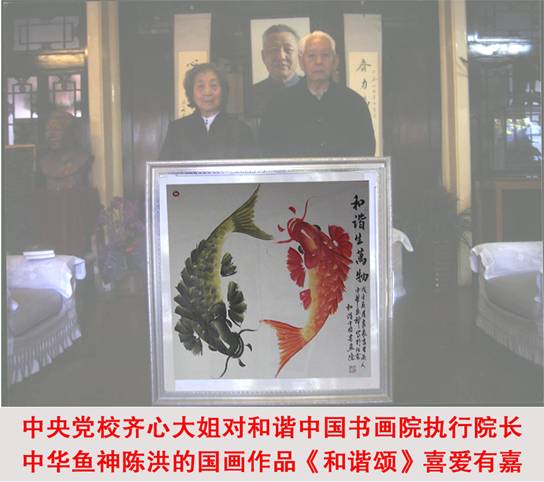 中央黨校齊心大姐對(duì)和諧中國書畫院執(zhí)行院長(zhǎng)中華魚神陳洪的國畫作品 《和諧頌》喜愛有嘉
